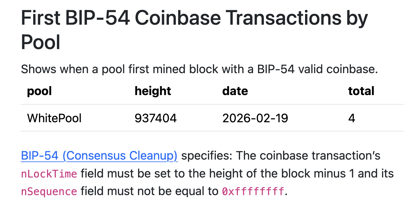 Shows the percentage of coinbase transactions that have their locktime set according to BIP-54.BIP-54 (Consensus Cleanup) specifies: The coinbase transaction’s nLockTime field must be set to the height of the block minus 1 and its nSequence field must not be equal to 0xffffffff.